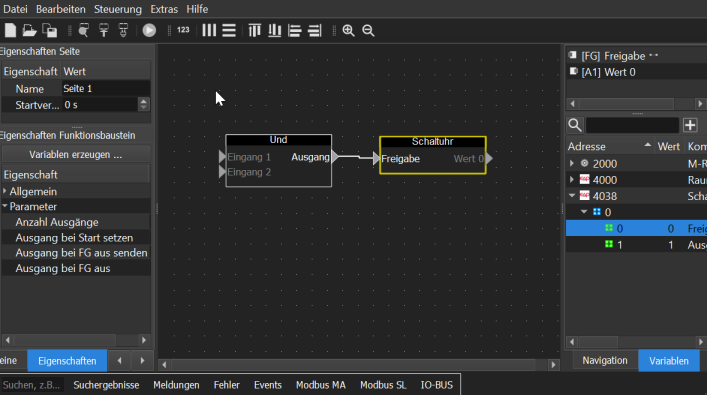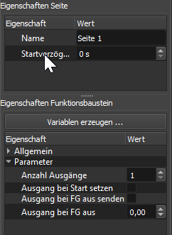 Links werden die Eigenschaften angezeigt, rechts die Variablen und die Ein- Ausgänge des Bausteins. Mit einem Klick auf den